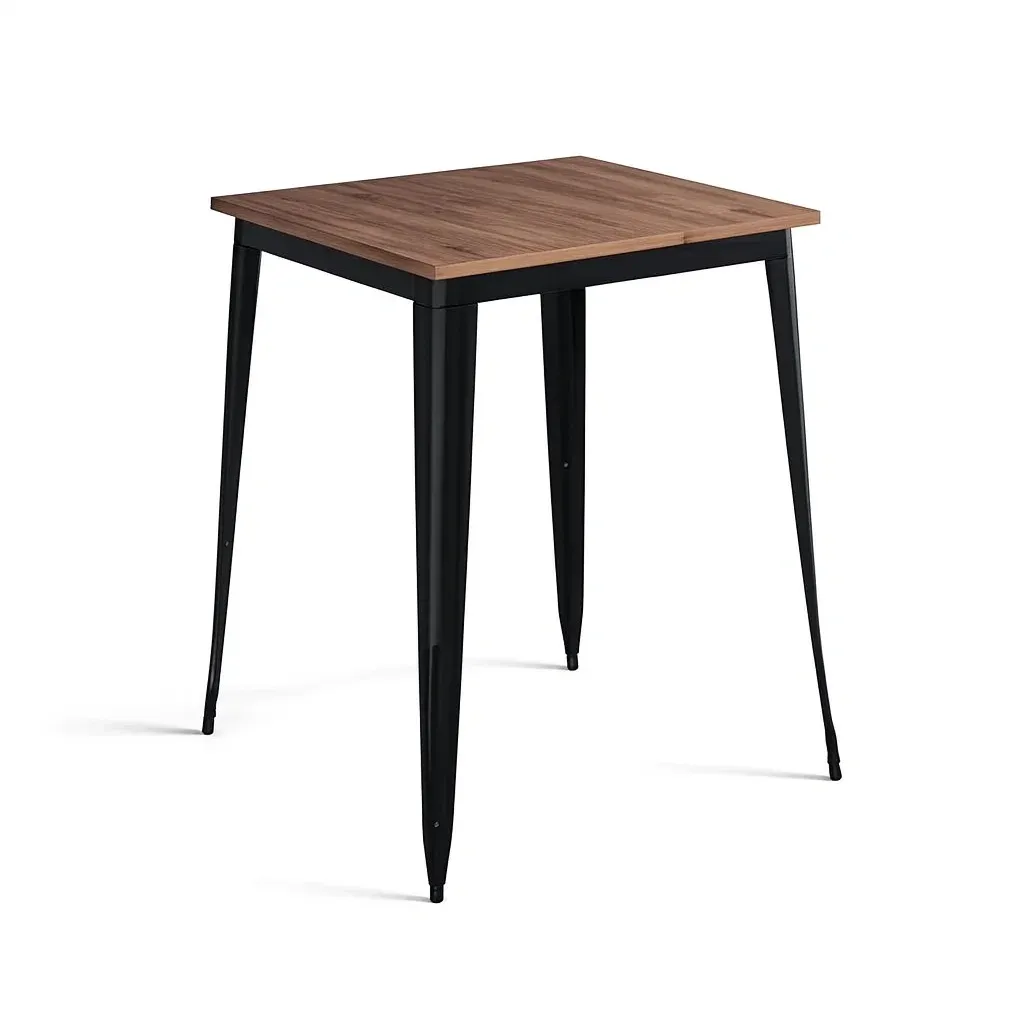 Cette table carrée possède un plateau en bois de noyer et des pieds en métal noir.